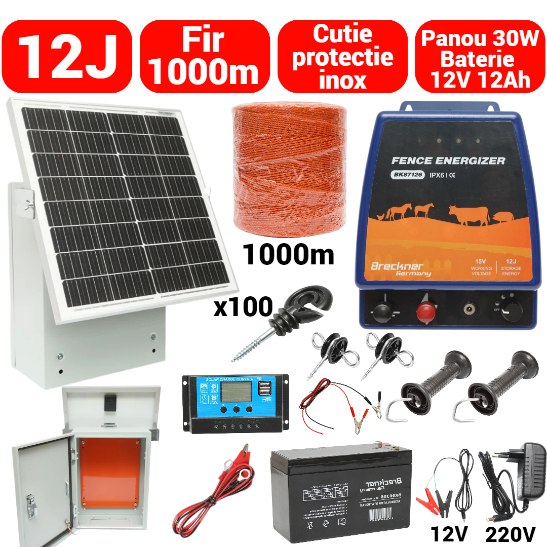 Kit pachet gard electric 12 Joule 12 220V 1000m cu kit fotovoltaic panou solar 30W baterie 12V 12Ah cutie protectie cu suport panou (BK87126-1000-30W-12Ah-Cutie)