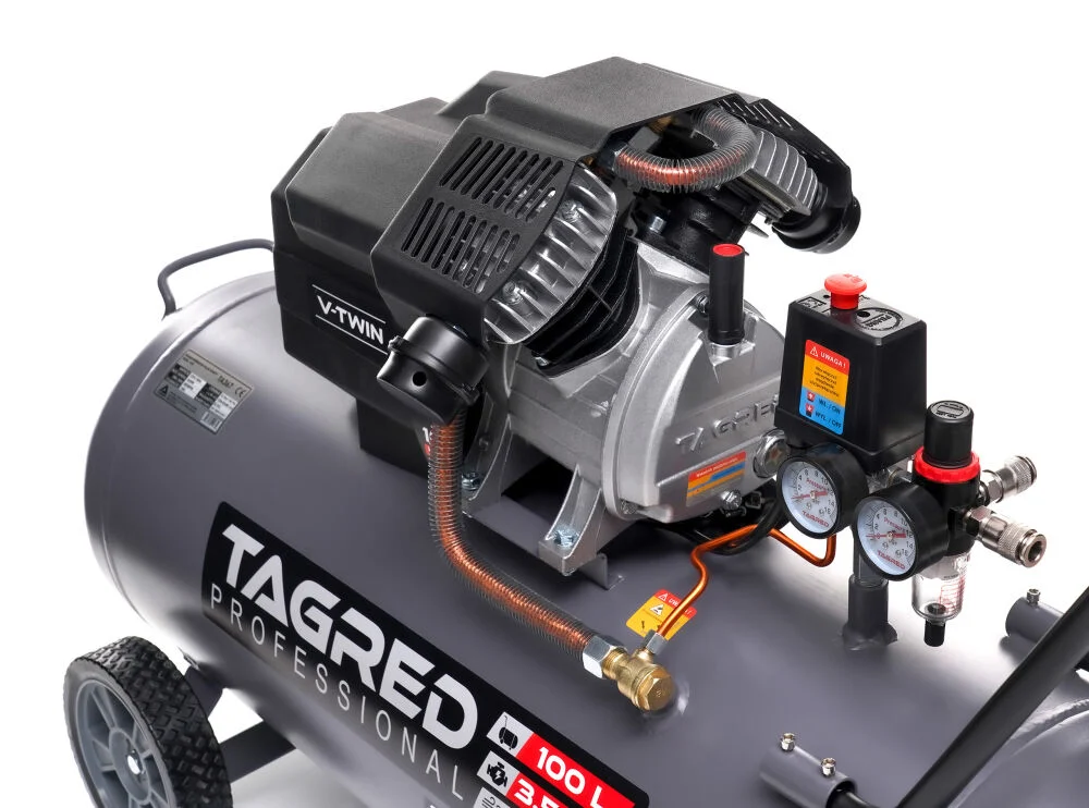 Compresor aer comprimat 100L 230V 3.5kw 640Lmin 10bar 2 pistoane (TA367) Compresorul TAGRED este un dispozitiv solid și eficient , conceput pentru umplerea rapidă a rezervorului, motor puternic și funcționare silențioasă . Datorită funcționării sale intuitive și asamblarii ușoare, este potrivită atât pentru uz casnic, cât și în atelier. Manopera estetica si durabila asigura fiabilitate si confort de utilizare multi ani! Date tehnice :