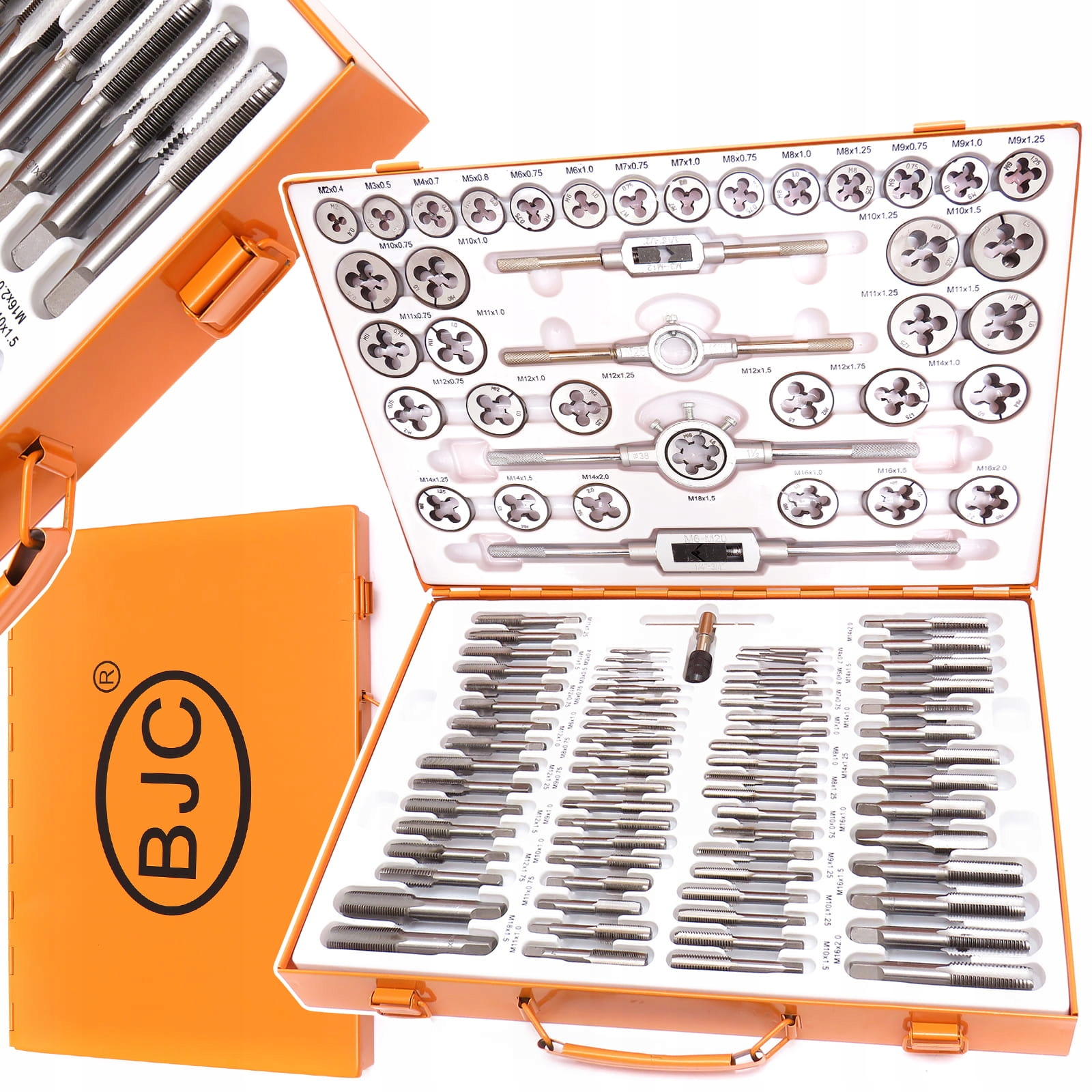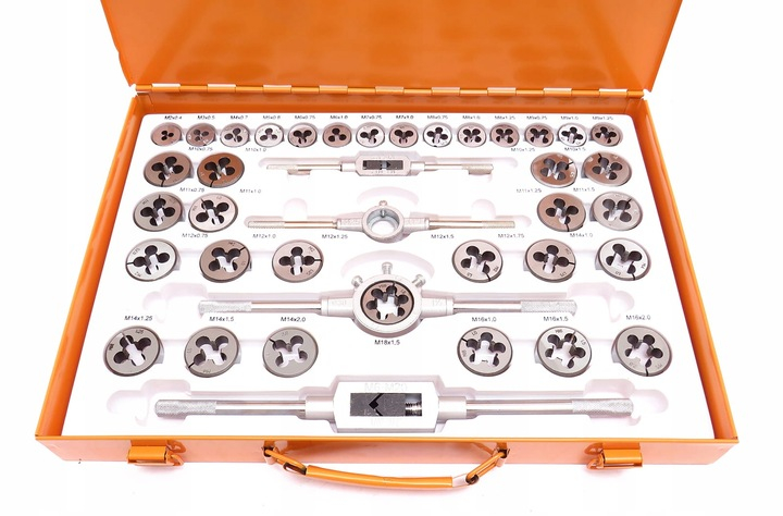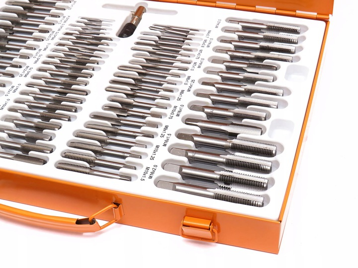 · 35 x 2 buc. robinete: M2x0,4mm; M3x0,5mm; M4x0,7mm; M5x0,8mm; M6x0,75mm; M6x1.0mm; M7x0,75mm; M7x1.0mm; M8x0,75mm; M8x1.0mm; M8x1.25mm; M9x0,75mm; M9x1.0mm; M9x1,25mm; M10x0,75mm; M10x1,0mm; M10x1,25mm; M10x1,5mm; M11x0,75mm; M11x1.0mm; M11x1,25mm; M11x1,5mm; M12x0,75mm; M12x1.0mm; M12x1,25mm; M12x1,5mm; M12x1,75mm; M14x1.0mm; M14x1,25mm; M14x1,5mm; M14x2.0mm; M16x1.0mm; M16x1,5mm; M16x2.0mm; M18x1,5mm;