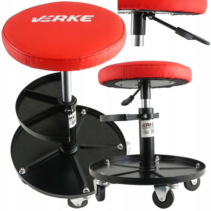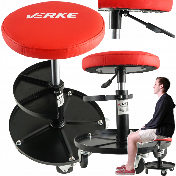 Scaunul de atelier Verke a fost conceput pentru a fi utilizat în ateliere profesionale, servicii auto, ateliere de reparații și, de asemenea, va funcționa excelent într-un garaj de acasă. Scaunul atelierului se rotește și are 5 roți care îi sporesc mobilitatea. O soluție practică este dotarea acestuia cu un raft suplimentar unde mecanicul poate așeza uneltele folosite în timpul lucrului. Învelișul scaunului confortabil este realizat din PVC. Datorită reglajului pneumatic pe înălțime, acesta poate fi ușor ajustat la înălțimea persoanei.