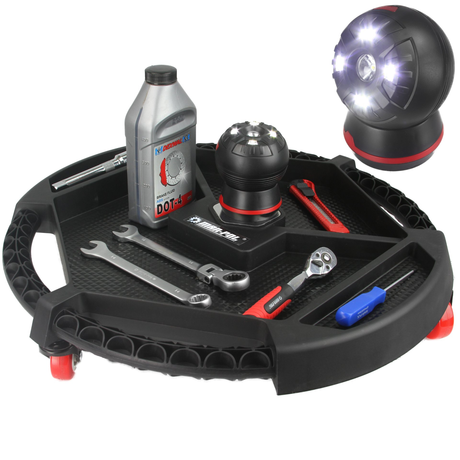 O tavă extrem de practică, mobilă și utilă, fabricată din materiale de înaltă calitate, rezistentă la uleiuri și grăsimi. Atenție - lichidul de frână, cheile și accesoriile pentru echipamente de atelier au fost adăugate în scop vizual și nu sunt de vânzare. Excelent pentru zone cu lumină slabă Lampa cu unghi de 360 de grade facilitează lucrul în locuri întunecate și slab iluminate. Cele 2 moduri de funcționare a lămpii vă permit să reglați luminozitatea luminii în funcție de nevoile dumneavoastră. Lampă multifuncțională de 360 de grade cu magnet Lampa este echipată cu lumini LED care pot fi comutate în diferite moduri de funcționare - cu 4 surse de lumină și 5 mA, întărite suplimentar de lumina principală situată în centrul sferei. În plus, mingea poate fi rotită liber cu 180 de grade pe verticală și pe orizontală , ceea ce oferă o gamă completă de rotație în jurul propriei axe. Mingea este montată pe un magnet, astfel încât nu va cădea din suport și se poate roti liber. Folosește mingea independent de tavă Designul tăvii vă permite să scoateți ușor mingea dintr-o singură mișcare. Putem plasa lampa folosind un magnet pe capota mașinii sau în orice alt loc pentru a ilumina zona de lucru. Partiții magnetizate suplimentar Tava are și două compartimente magnetizate . Acest magnet puternic vă va menține spațiul de lucru organizat, împiedicându-vă să pierdeți șuruburi și alte obiecte. Magnet puternic - după înclinarea semnificativă a tăvii (peste 90 de grade), șurubelnița rămâne în poziție. Pereți despărțitori proiectați dintr-un material cu o textură specială Iluminează-ți zona de lucru și ajunge în locuri greu accesibile chiar și în întuneric complet Lampa este alcătuită din două părți, dintre care una este magnetizată, datorită căreia o putem atașa pe orice suprafață metalică. Tava este echipată cu 4 mânere ergonomice care facilitează manevrarea acesteia chiar și în condiții dificile sub mașină. 3 roți cu rulmenți permit mișcarea liberă a tăvii, chiar și atunci când este culcată.