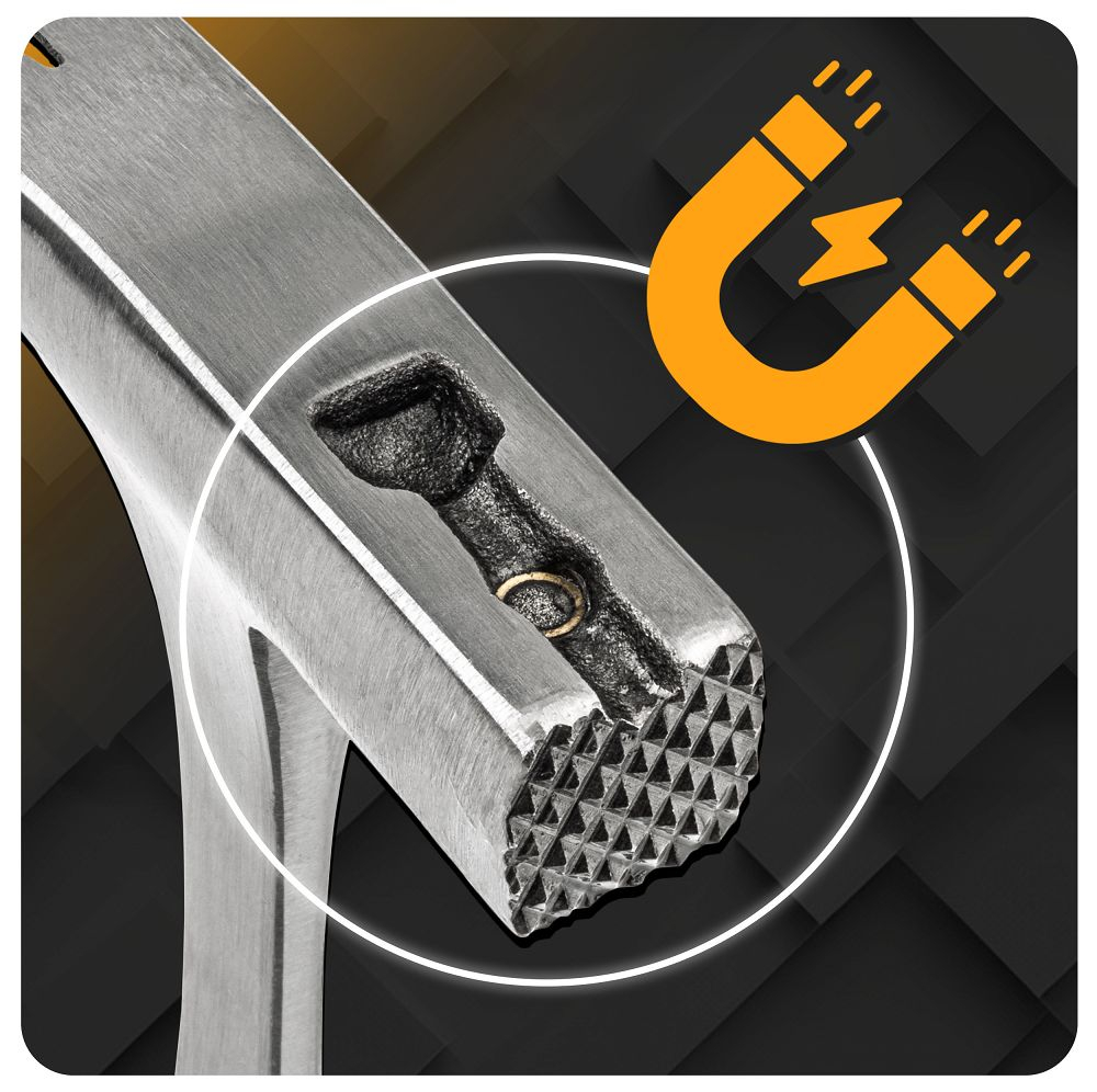 Ciocanul are o canelură magnetică ce vă permite să pre-setați cuiul fără a folosi a doua mâna. Această soluție accelerează lucrul, crește precizia loviturilor și îmbunătățește siguranța, în special la lucrul la înălțime sau în locuri greu accesibile.