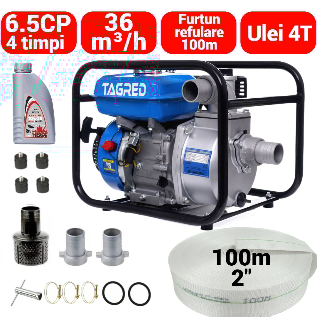 Motopompa benzina 4timpi 6.5CP + furtun 100m 2 toli + ulei motor
