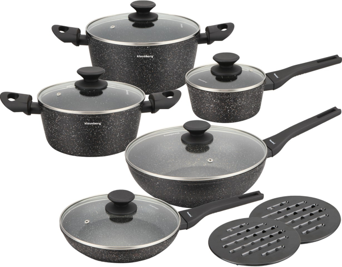 Set vase pentru gatit cu invelis antiaderent din marmura, 12 piese, 4 oale, 2 tigai, 5 capace si suporturi termorezistente (KB-7657)
