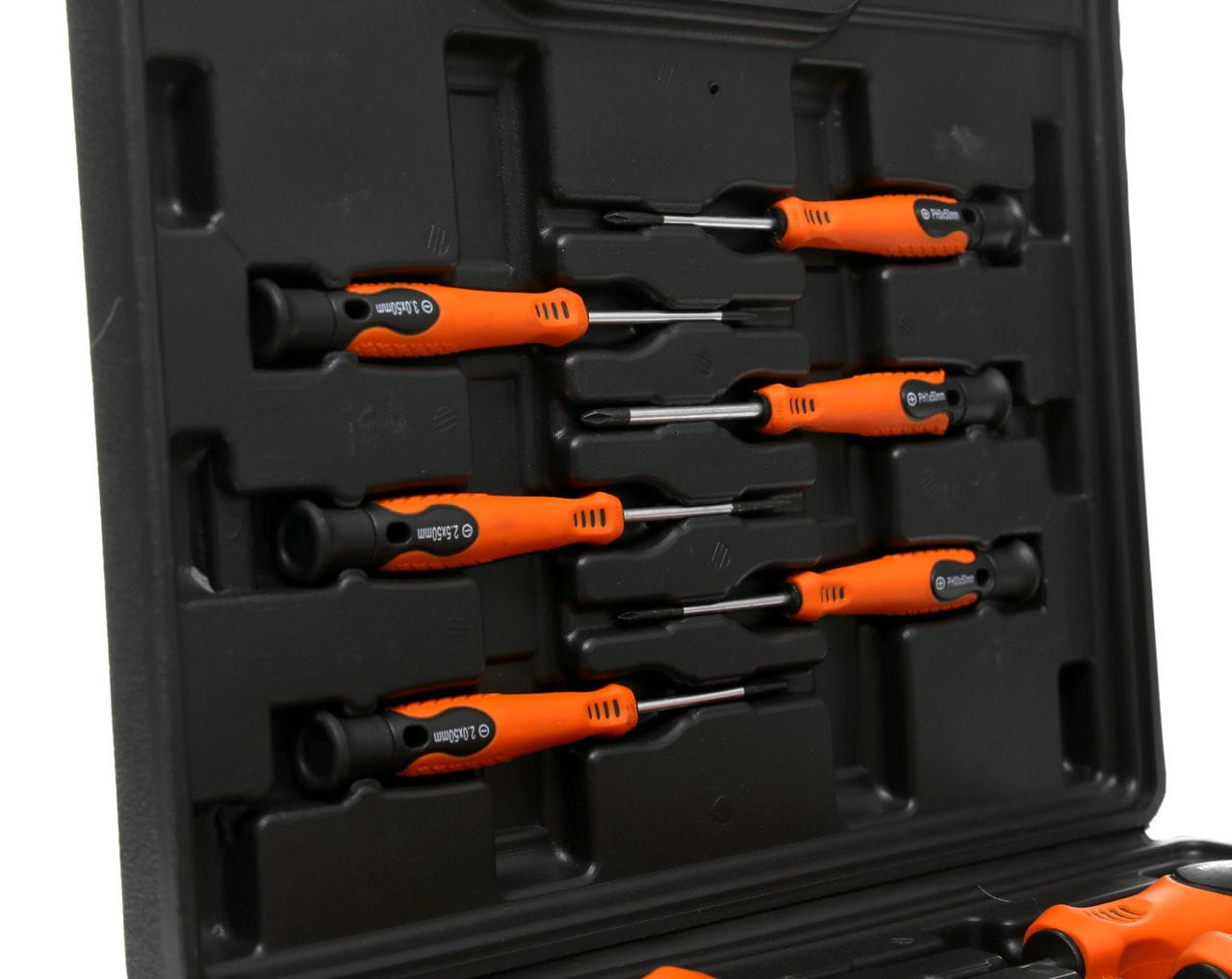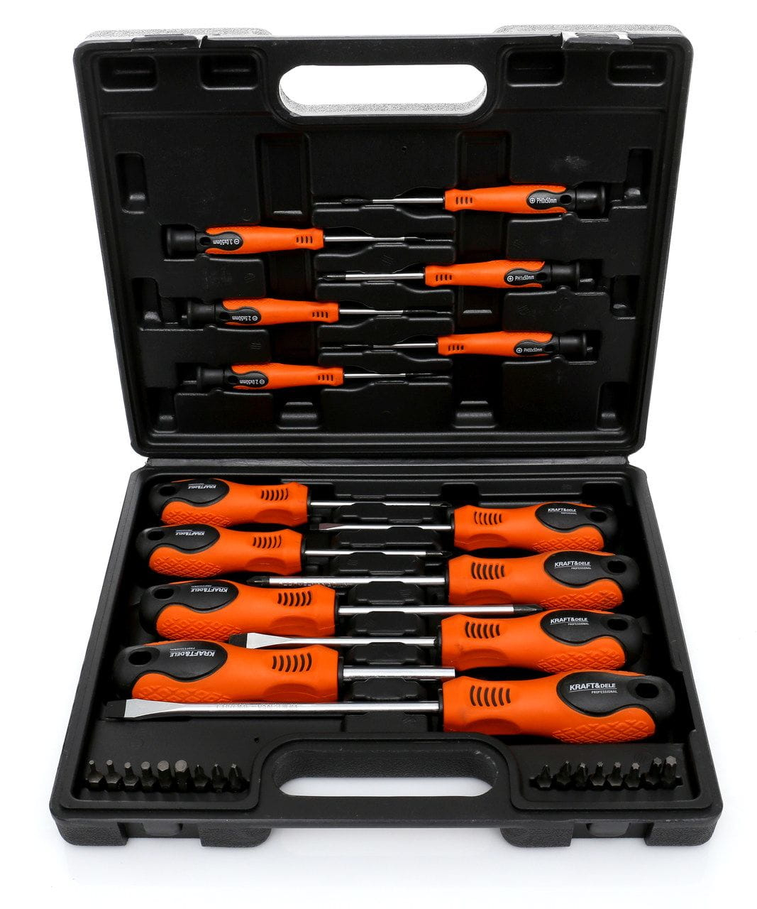 Setul de șurubelnițe și biți KD10902 de la Kraft & Dele este un plus perfect pentru orice garaj sau atelier. Geanta de transport inclusă facilitează depozitarea șurubelnițelor.