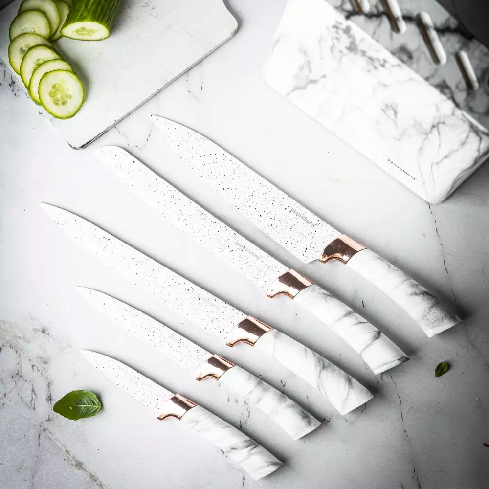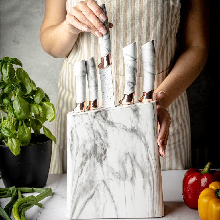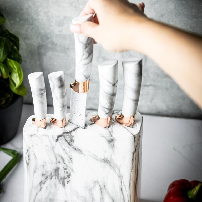 Cutite de bucatarie in suport albe cu design maro set 6 piese (KB-7769)