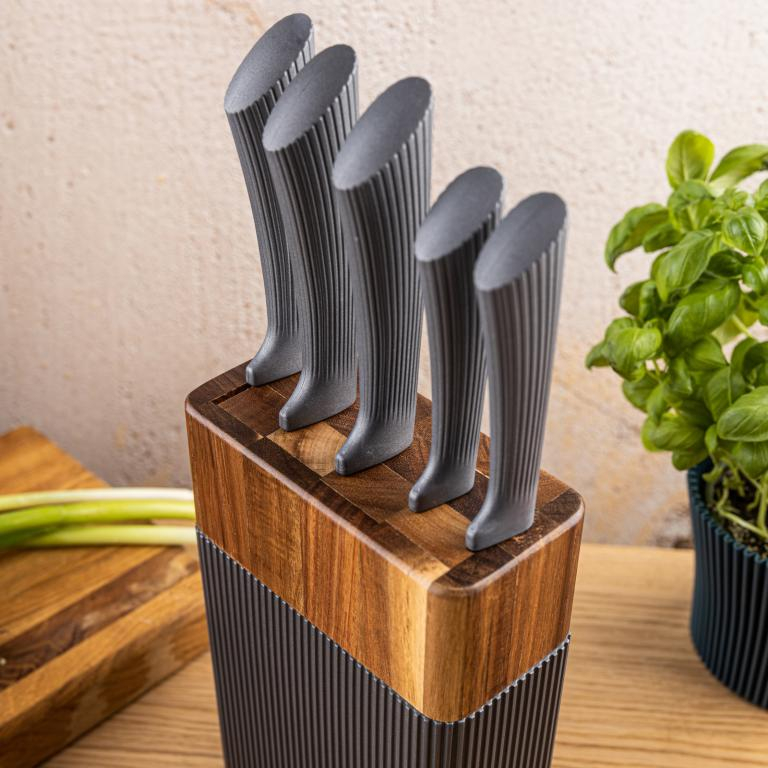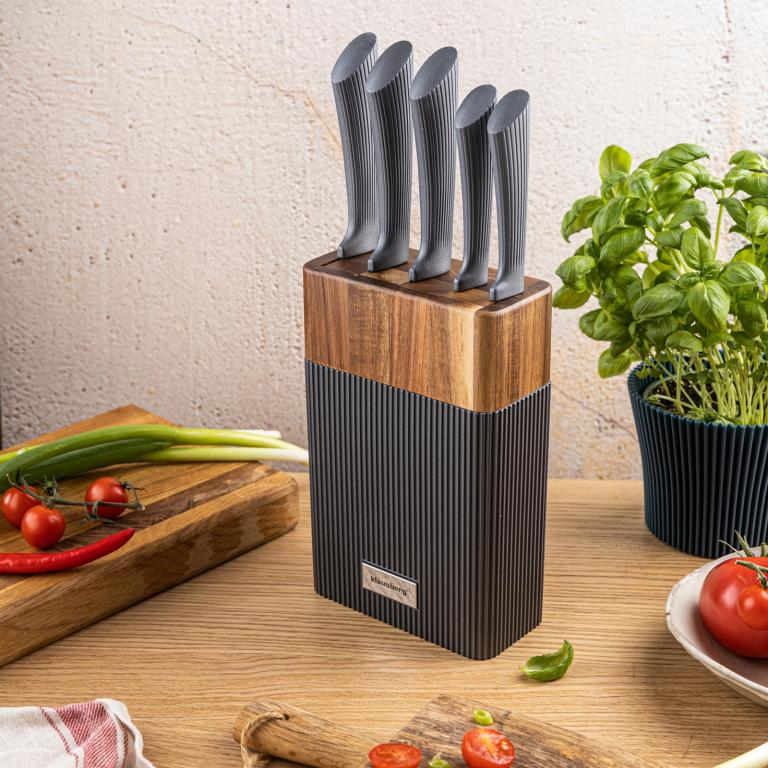 Eleganță, ordine și claritate în bucătăria de zi cu zi – KLAUSBERG KB-7979 este un set de 6 piese care include cinci cuțite esențiale și un bloc robust cu blat din lemn de salcâm și corp gri grafit cu nervuri. Lamele din oțel inoxidabil garantează durabilitate și precizie, în timp ce mânerele ergonomice cu caneluri oferă o prindere sigură și confort în timpul lucrului. Designul modern și discret completează orice bucătărie – atât clasică, cât și contemporană.