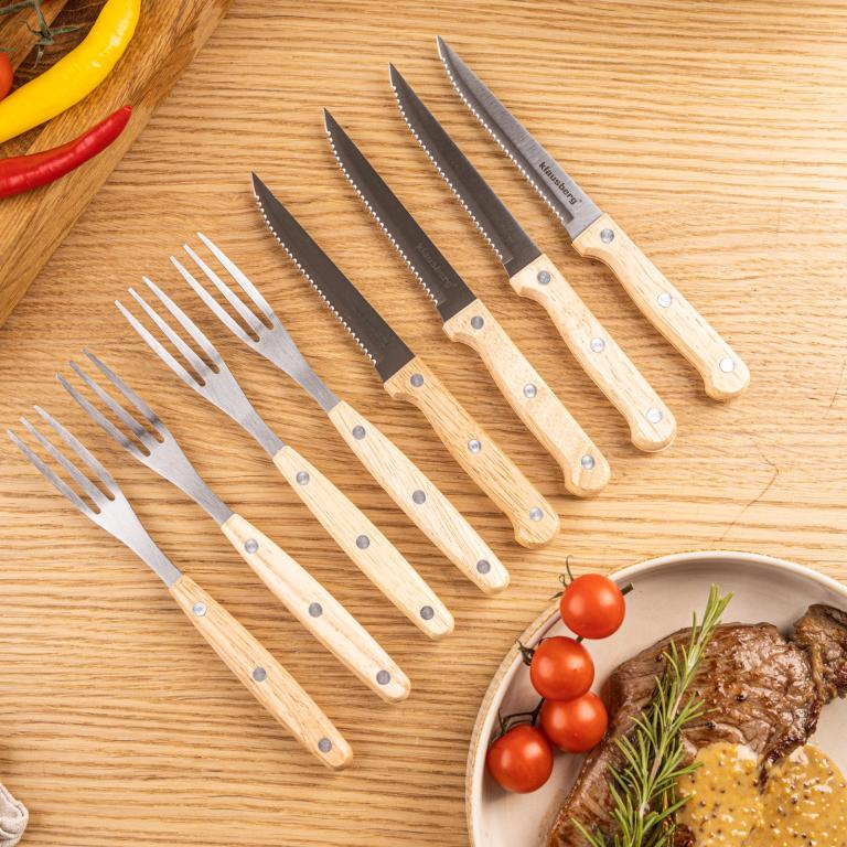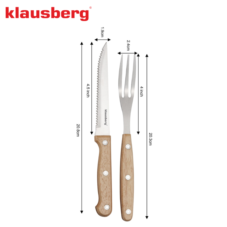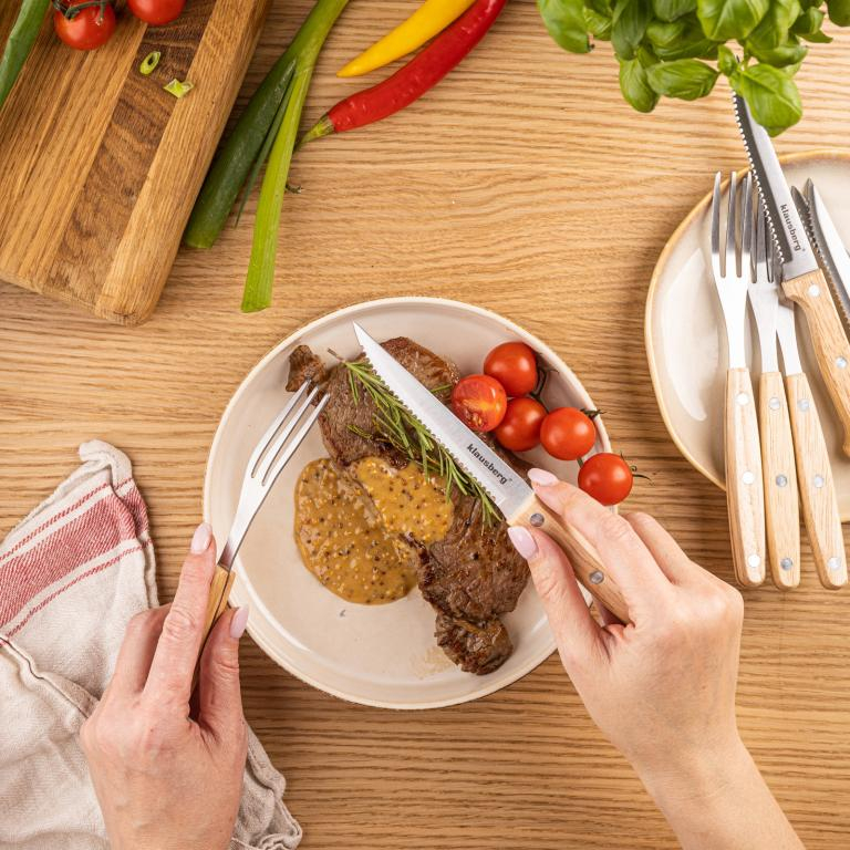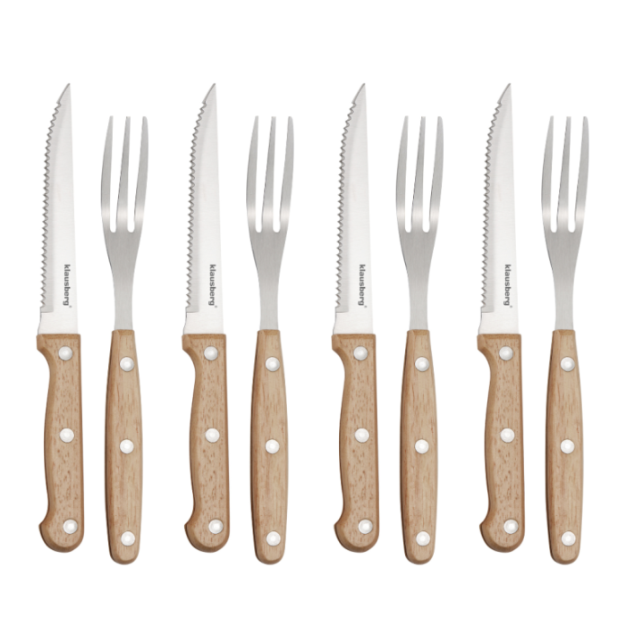 Elegantul și robustul set pentru friptură și grătar KLAUSBERG KB-7976 este o alegere ideală pentru iubitorii de carne, grătar și mâncare bună în stil rustic. Setul include 8 articole - 4 cuțite zimțate ascuțite și 4 furculițe din oțel inoxidabil de înaltă calitate . Mânerele din lemn nituite oferă o prindere naturală și sigură și conferă setului un aspect elegant și clasic. Setul este perfect pentru cine în familie, grătare în grădină, camping, restaurante sau rulote cu mâncare. Este, de asemenea, o idee grozavă de cadou pentru orice fan al grătarului și al gătitului cu carne.