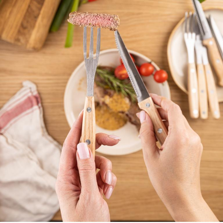 Nu. Mânerele din lemn necesită spălare manuală și uscare temeinică după utilizare. Pot cuțitele să taie carne tare?
