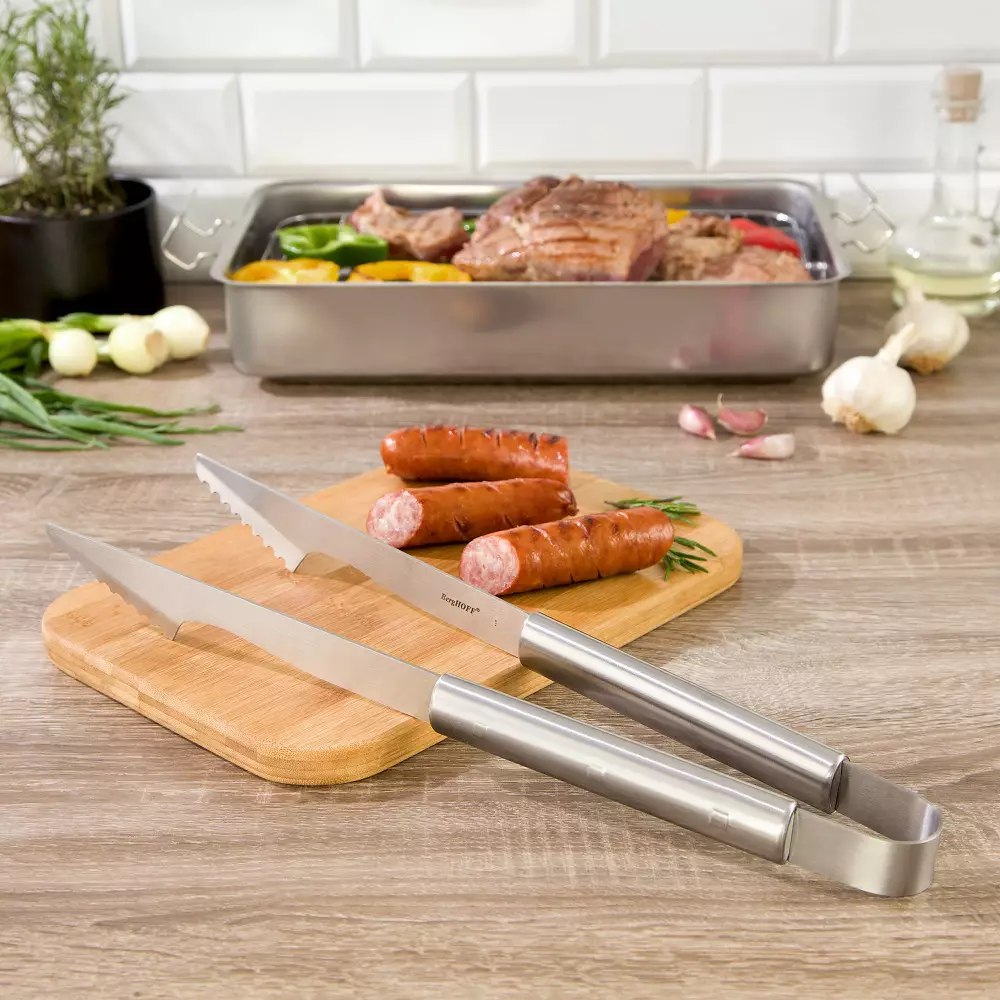 Clește de grătar din oțel inoxidabil X20CR13 de înaltă calitate. Ușor și convenabil de utilizat datorită designului ergonomic. Mânerul lung protejează mâna de temperaturile ridicate. Marginile zimțate vă permit să prindeți ferm și să întoarceți în siguranță toate alimentele la grătar.