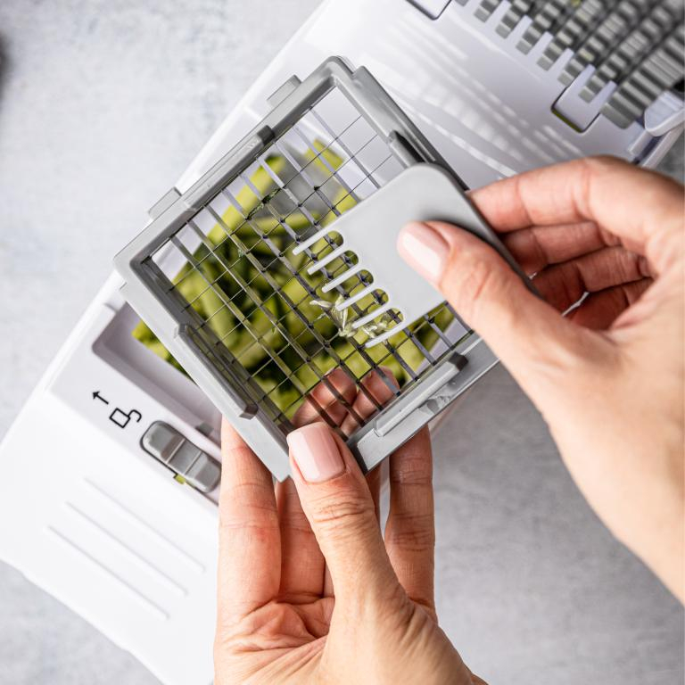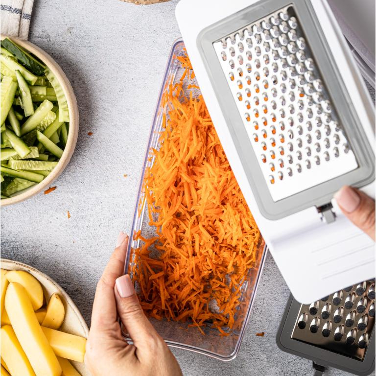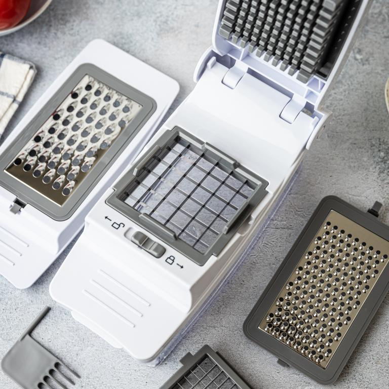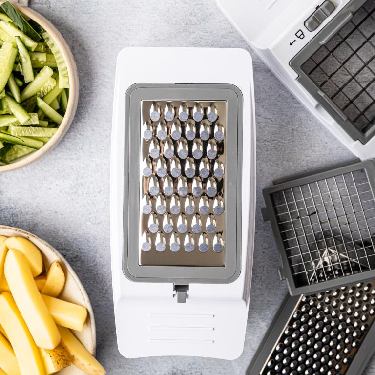 • 5 lame interschimbabile – Setul include cinci lame cu modele diferite, permițând diferite stiluri de feliere și mărunțire. Peria inclusă permite curățarea ușoară a lamelor.
